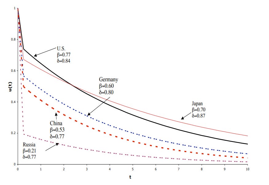 Finally, that’s here’s a chart from Wang et al., (2011)5 comparing time discounting of the USA, Germany, Japan, China and Russia.