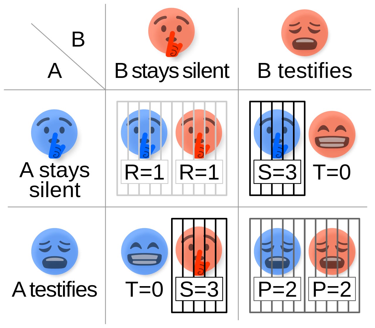 Two members of a criminal gang are arrested and imprisoned. Each prisoner is in solitary confinement with no means of speaking to or exchanging messages with the other. The police admit they don't have enough evidence to convict the pair on the principal charge. They plan to sentence both to a year in prison on a lesser charge. Simultaneously, the police offer each prisoner a Faustian bargain. If he testifies against his partner, he will go free while the partner will get three years in prison on the main charge. Oh, yes, there is a catch ... If both prisoners testify against each other, both will be sentenced to two years in jail. The prisoners are given a little time to think this over, but in no case may either learn what the other has decided until he has irrevocably made his decision. Each is informed that the other prisoner is being offered the very same deal. Each prisoner is concerned only with his own welfare—with minimizing his own prison sentence.