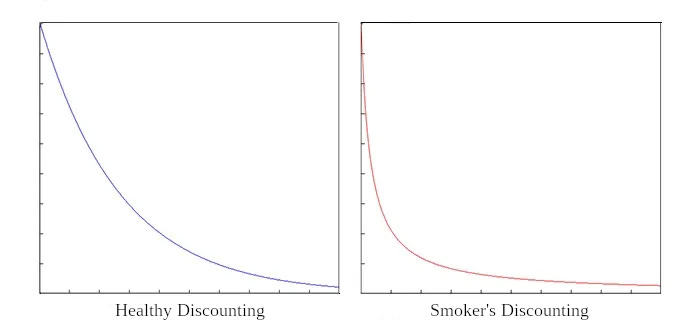 However, individuals facing addiction struggles, such as alcoholics, drug addicts, and smokers attempting to quit, exhibit a different pattern of discounting. For them, the value of a reward diminishes rapidly in the immediate future, with little significance placed on rewards obtainable in a month or beyond. This behavior is known as hyperbolic discounting and is not limited to those battling addictions but also extends to individuals living day-to-day.